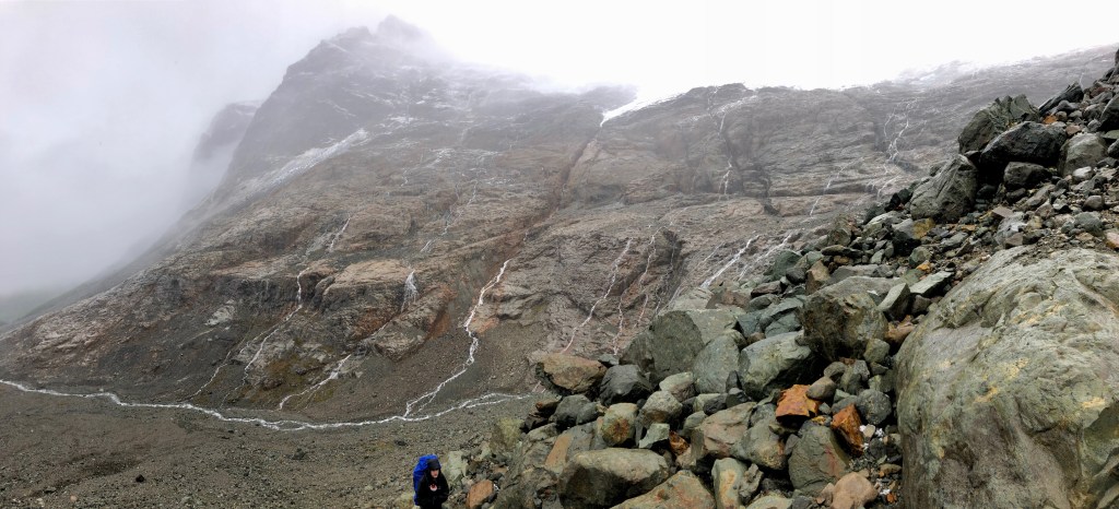 After the pass it is a long, steep descent through massive rocks. It was cloudy when we went down but pretty to see many mini waterfalls and the valley below. You can see trees at the bottom and I thought that was where the campsite is, but it isn’t. You’ll come to a larger river crossing, look to the left (down river) and you will see a nice place to cross with a stable plank across the rocks.