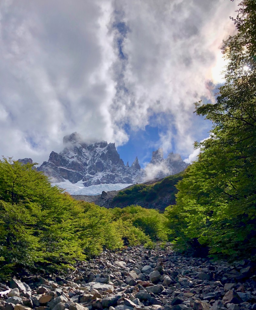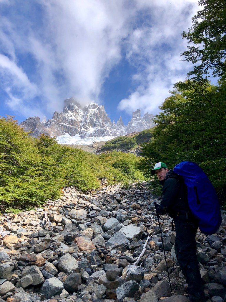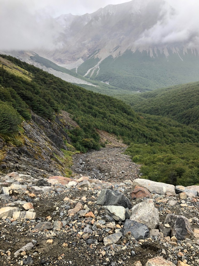 The next morning we packed up and the guide suggested we check out the the ‘secret laguna’ at the back. You basically walk behind the loo with a view, up over the ridge and across a field of rocks from an previous eruption, across a (melted) glacier field of rocks to the back of Cerro Castillo looking at Peñón. Turn around and look for the massive boulder so you know where to enter the woods when you come back. We went to the green lake and watched ice flows float around. Back to camp to start the last day of hiking. This side hike took about an hour and was well worth it.