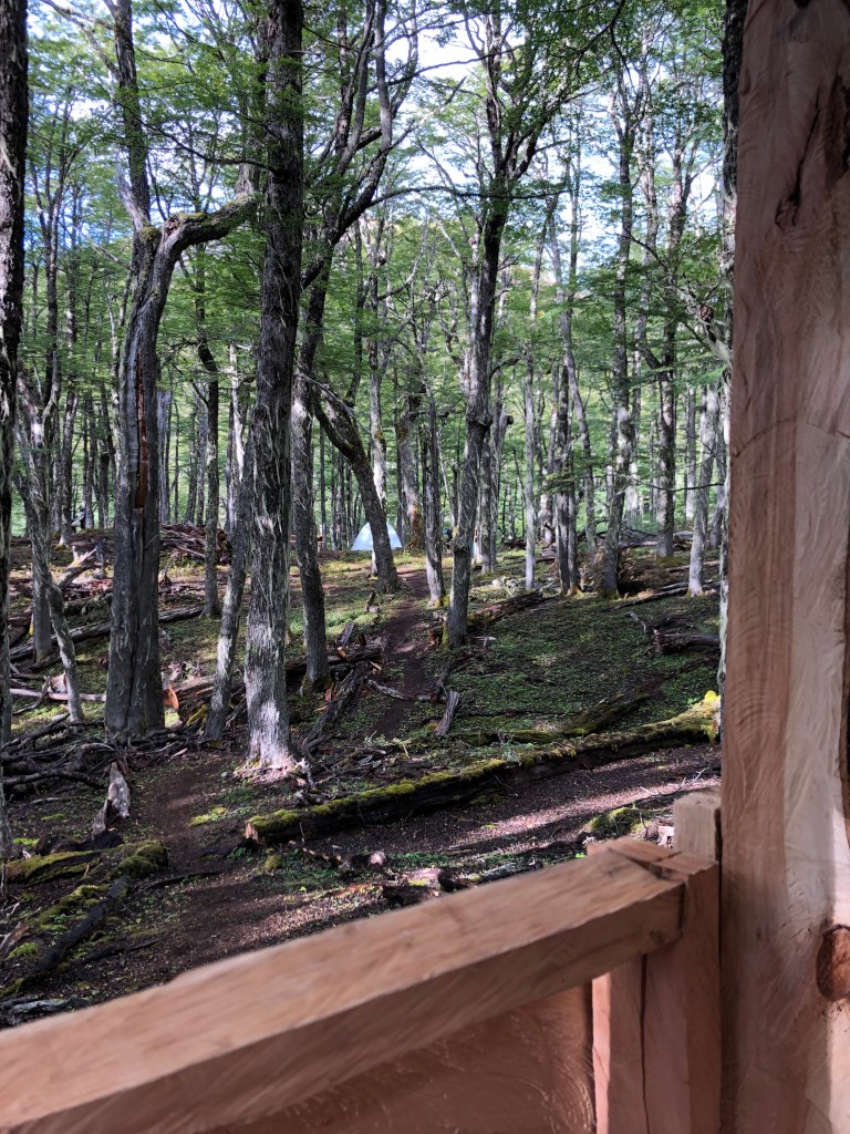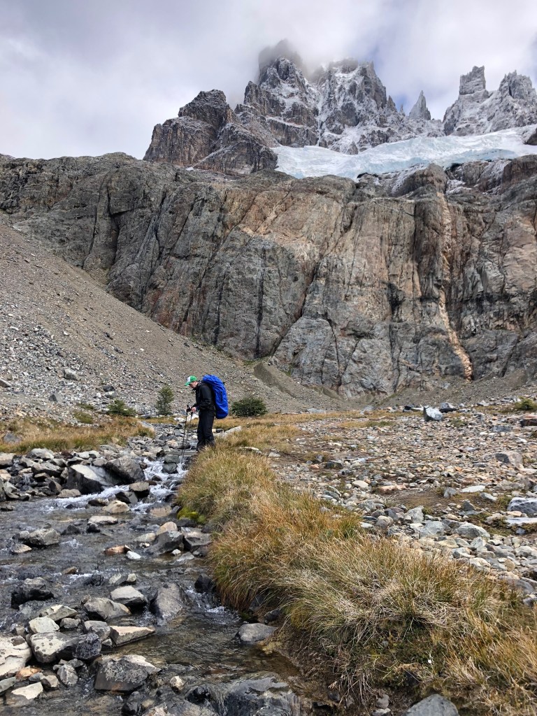 After another 30 or more minutes of hard uphill walking you’ll arrive at El Bosque — a nice place to stay the night. It was our only option to camp as the site further on and closer to the laguna (La Tetera) was closed due to misuse by campers. La Tetera, when it reopens, would be a gorgeous campsite with stunning views but very cold and windy as it’s more exposed. And there is quite a bit of climbing to get to La Tetera at the end of a long second day. Our friends were able to stay there in November and it was beautiful for them to wake up and see the Castillo in the morning. But it didn’t matter as it was closed, so we pitched up in El Bosque. Which is a bit like teetering on the edge of a gorge. You can walk down the gorge to the stream to get water. There was a ranger there and he let us know La Tetera was closed and that he would also be closing the Neozelandes due to snow on the pass.