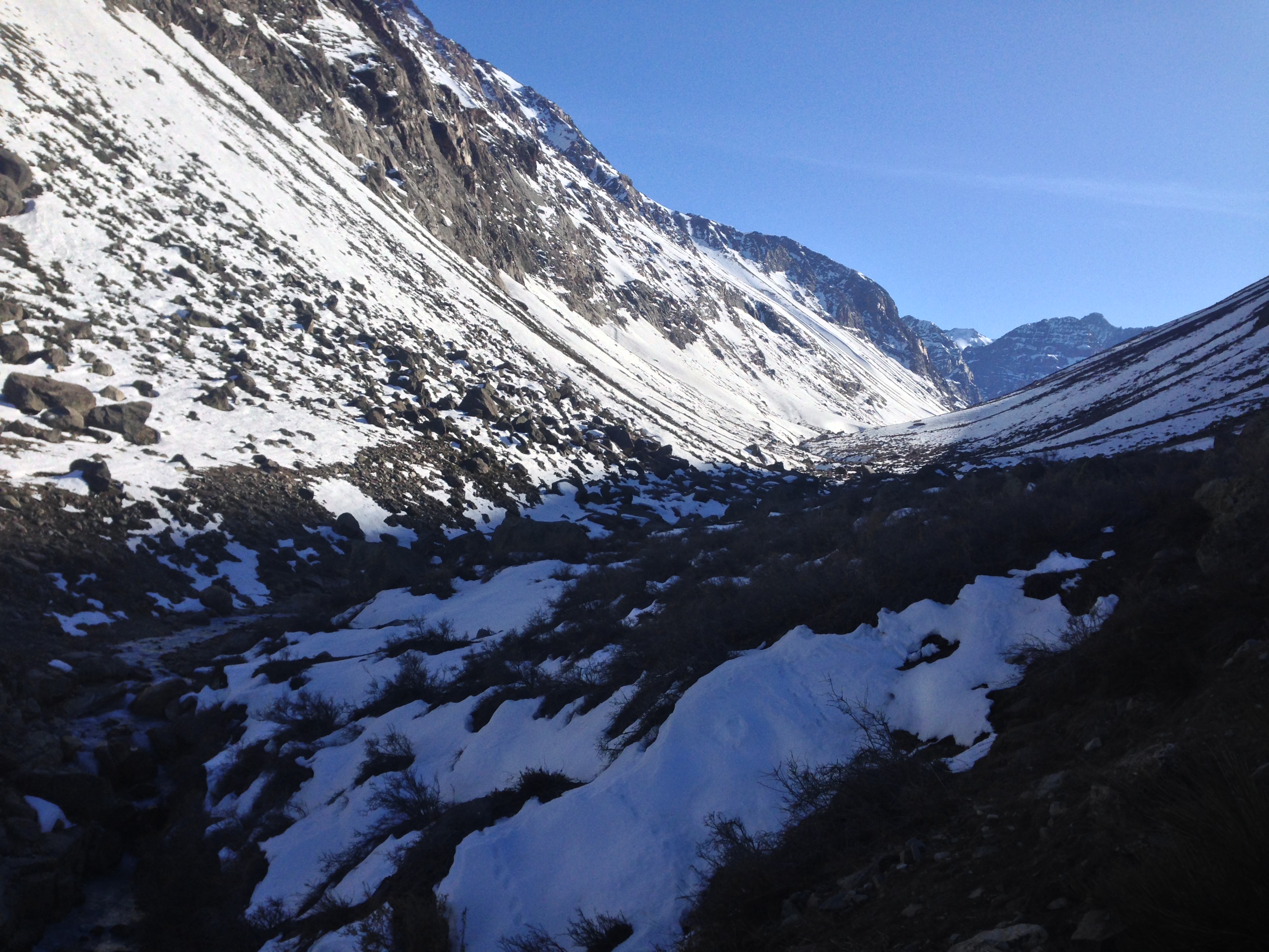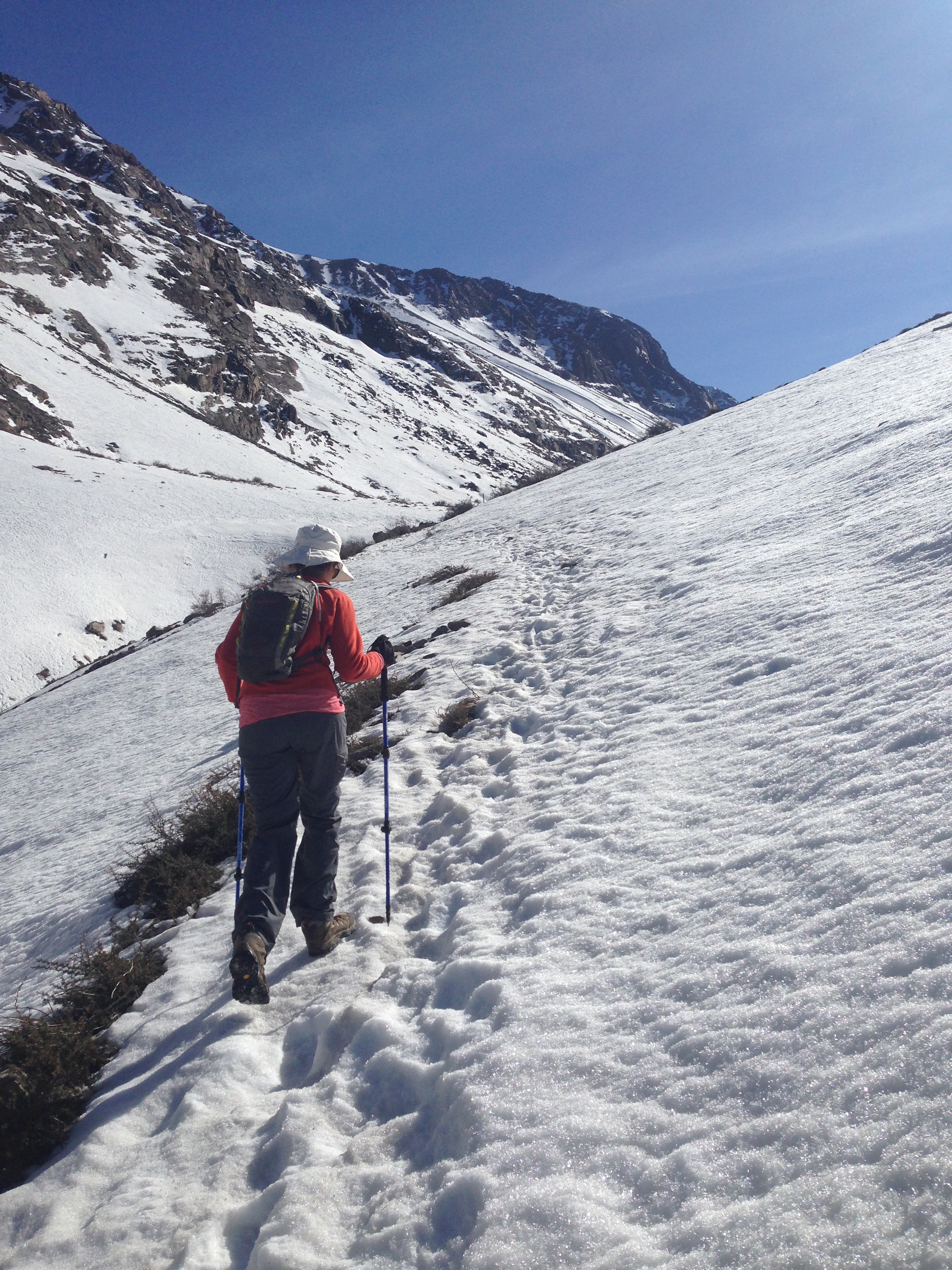 Within an hour we were walking on snow. It was on an angle, hard packed and a bit slippy. But so nice to be on snow again! There are big blue poles marking the path but basically you walk above the river and keep it to your left.