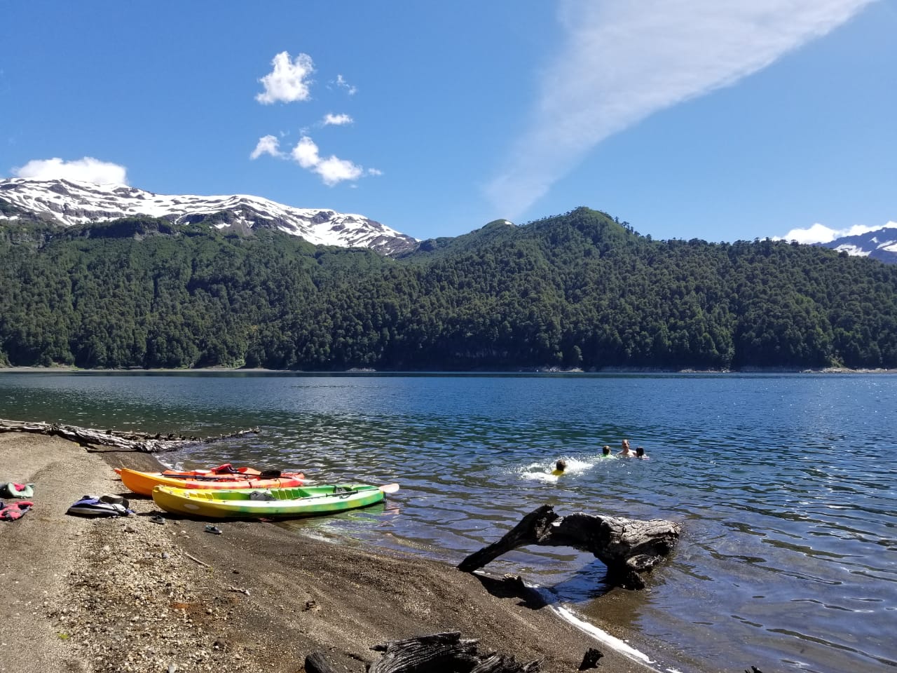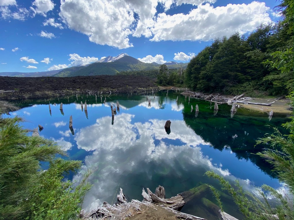 Our third day dawned clear and calm so we headed down early to the lake to rent kayaks. At 10 a.m. the lake was like a mirror and we headed out in three kayaks. (Wear a swimsuit and clothes that can get wet as they are open kayaks.) We kayaked to the left to find the hidden waterfall. The lake is so clear and deep. We pulled up on a beach and had a swim in the gorgeous lake water and then back to the cafe for lunch. It was $24,000 for three kayaks for over an hour. Then we needed some signal to book horseback riding. It’s $1,000 pesos/minute at the cafe, but the girls at the cabins told us you can get a weak signal by Laguna Verde, so we drove over there. Afterwards we continued on to Arco Iris which is a colourful lake with sunken trees and views of Llaima Volcano. You can also park and walk around the lake which we did when we visited the park the first time.