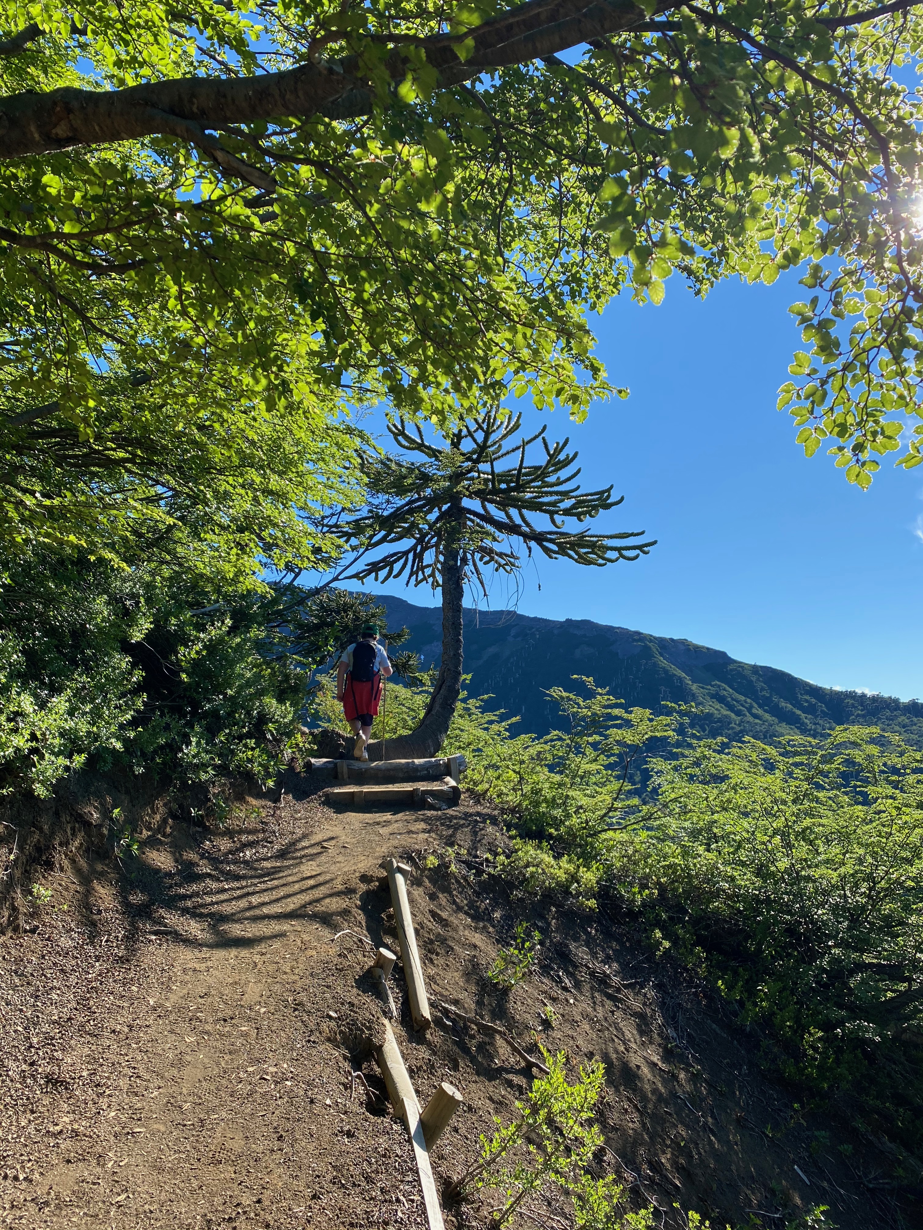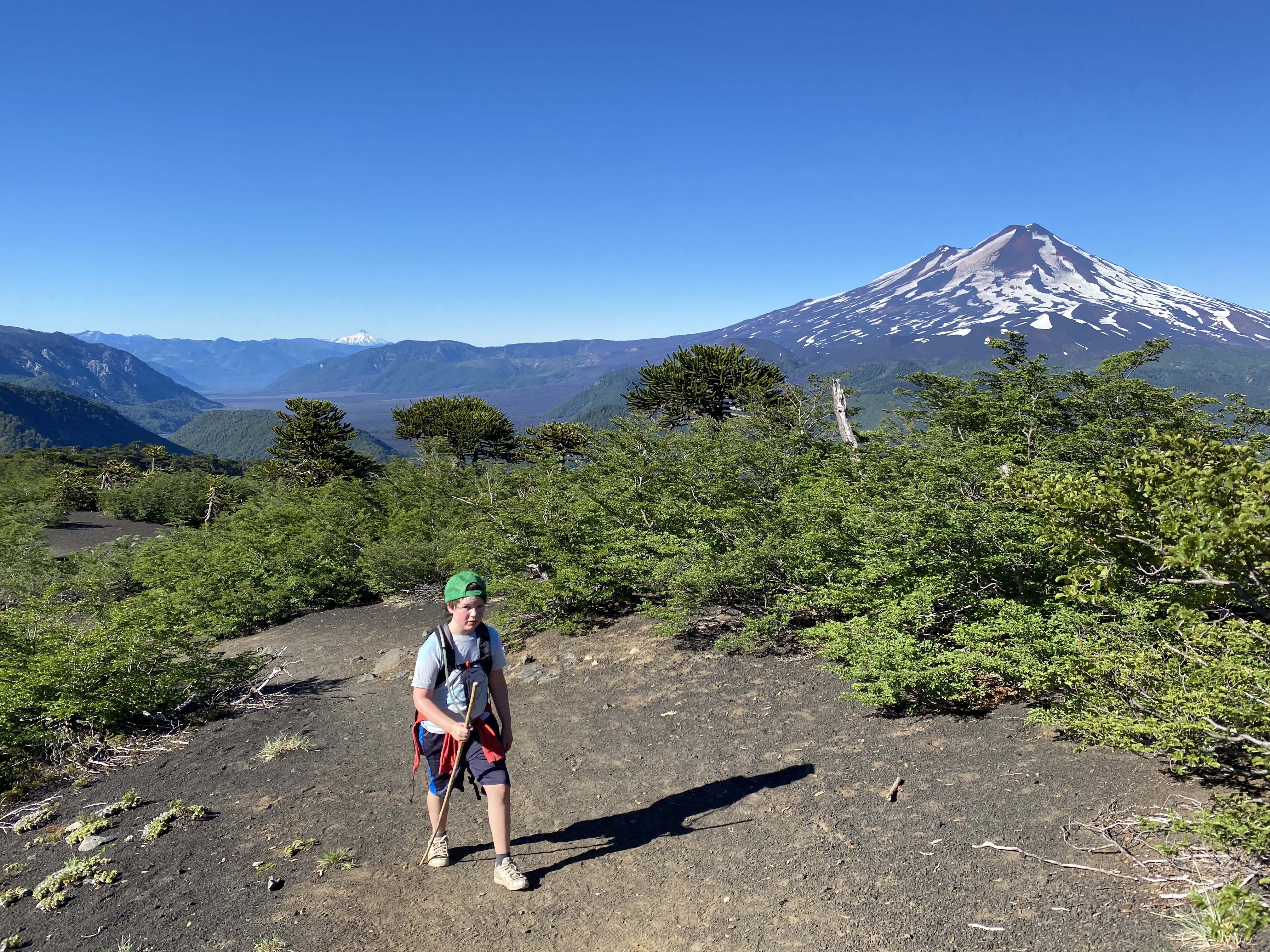 I really wanted to do the Sierra Nevada hike and my 11-year-old came with me. My husband dropped us off at 7:30 a.m. and we were the only ones on the trail (until we started to come down we didn’t see a soul!) In just over an hour we were at the first lookout and by an hour and a half we were half way to the top. The first half of the hike is in forest with glimpses of Llaima volcano and the lake.
