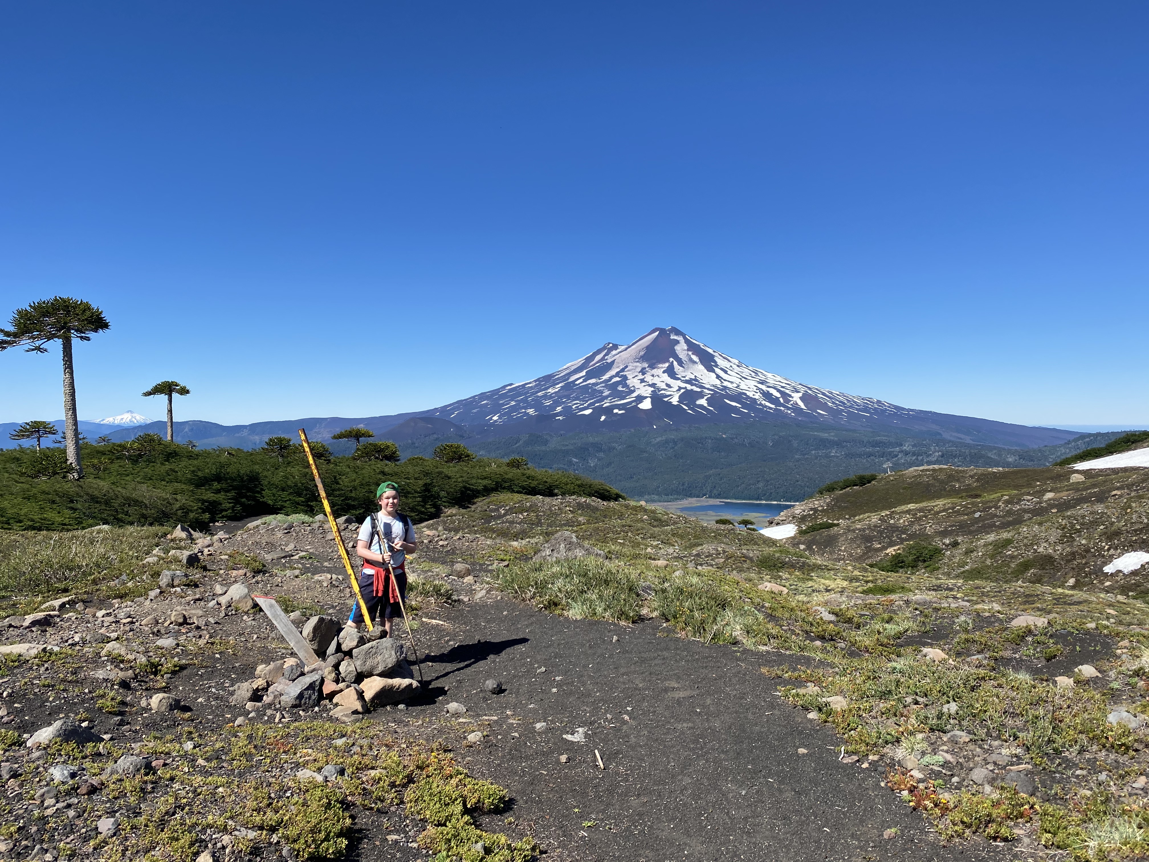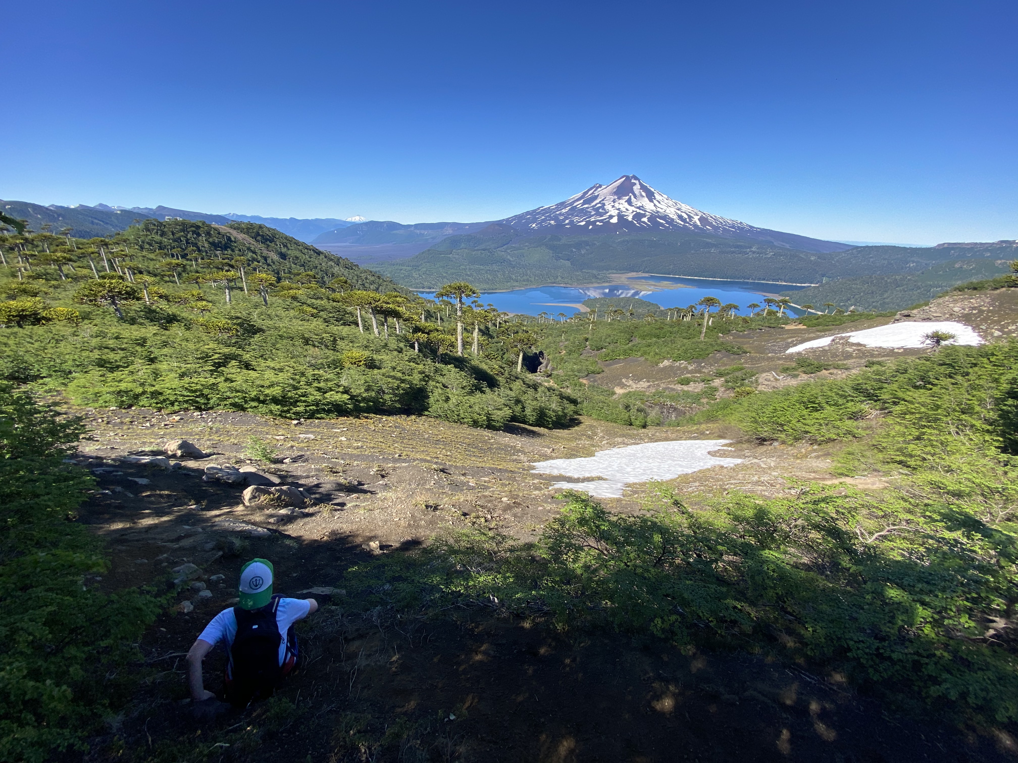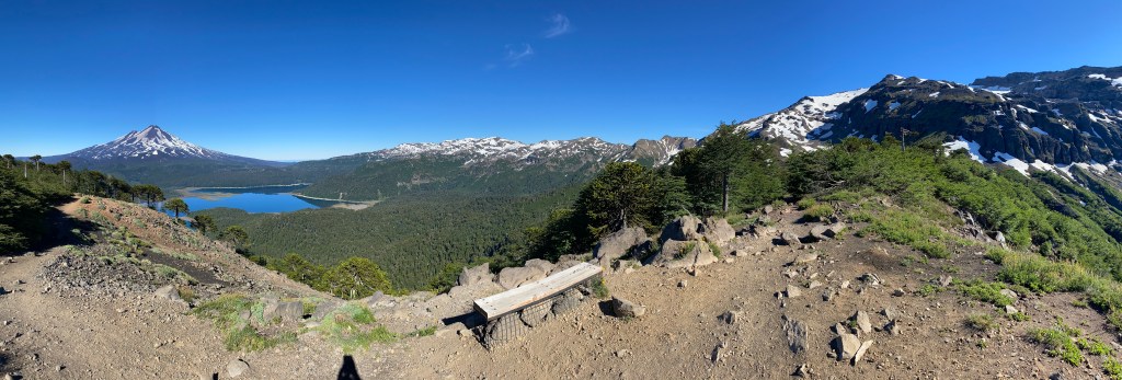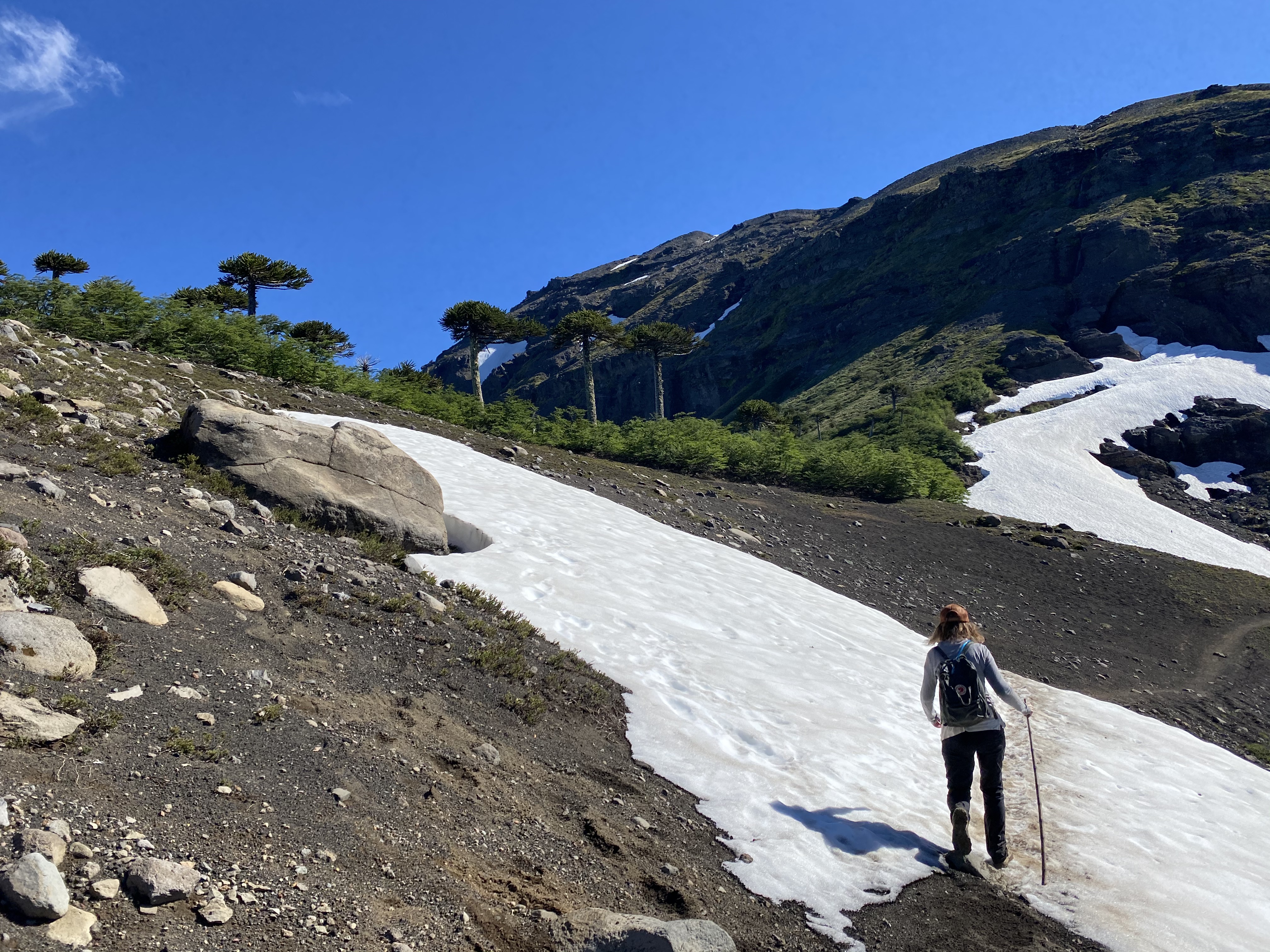 After awhile you will emerge to the backside of the Sierra Nevada range and it’s more exposed, fewer trees, with a huge drop to your right and views to the back of Volcan Villarrica. You end up walking on volcanic rock on the top of the ridge and then you wind your way to the right, we went over snow, and then you do a sharp left up through a bit of scrub. After you come out you will see the trail descend a bit (we walked over snow and rushing water underneath) and then the trail split in two. To the left is a bench with fantastic views over the araucaria trees, the lake and volcano. If you take the right part of the path it takes you to technically the end of the trail, marked with a tall yellow pole.