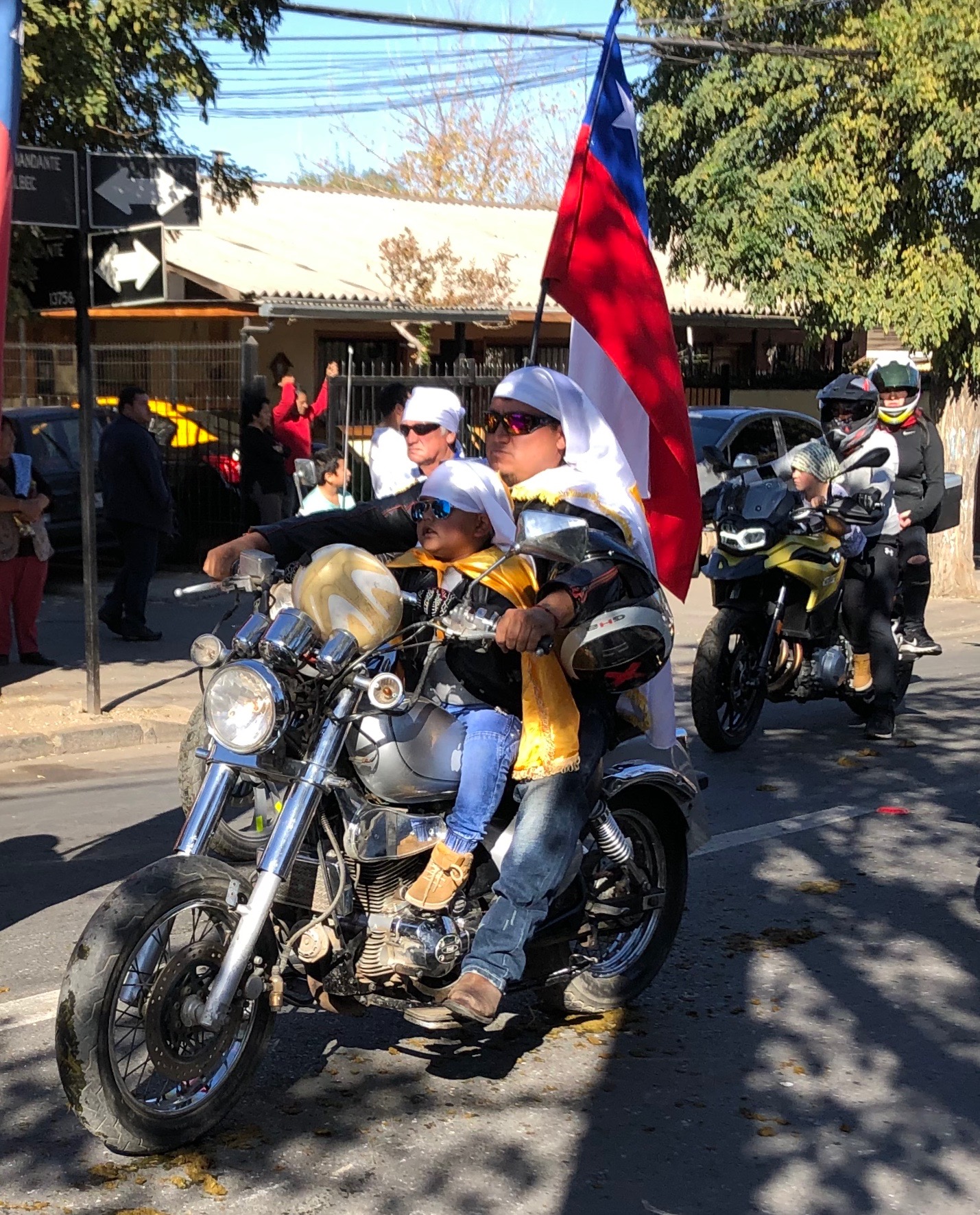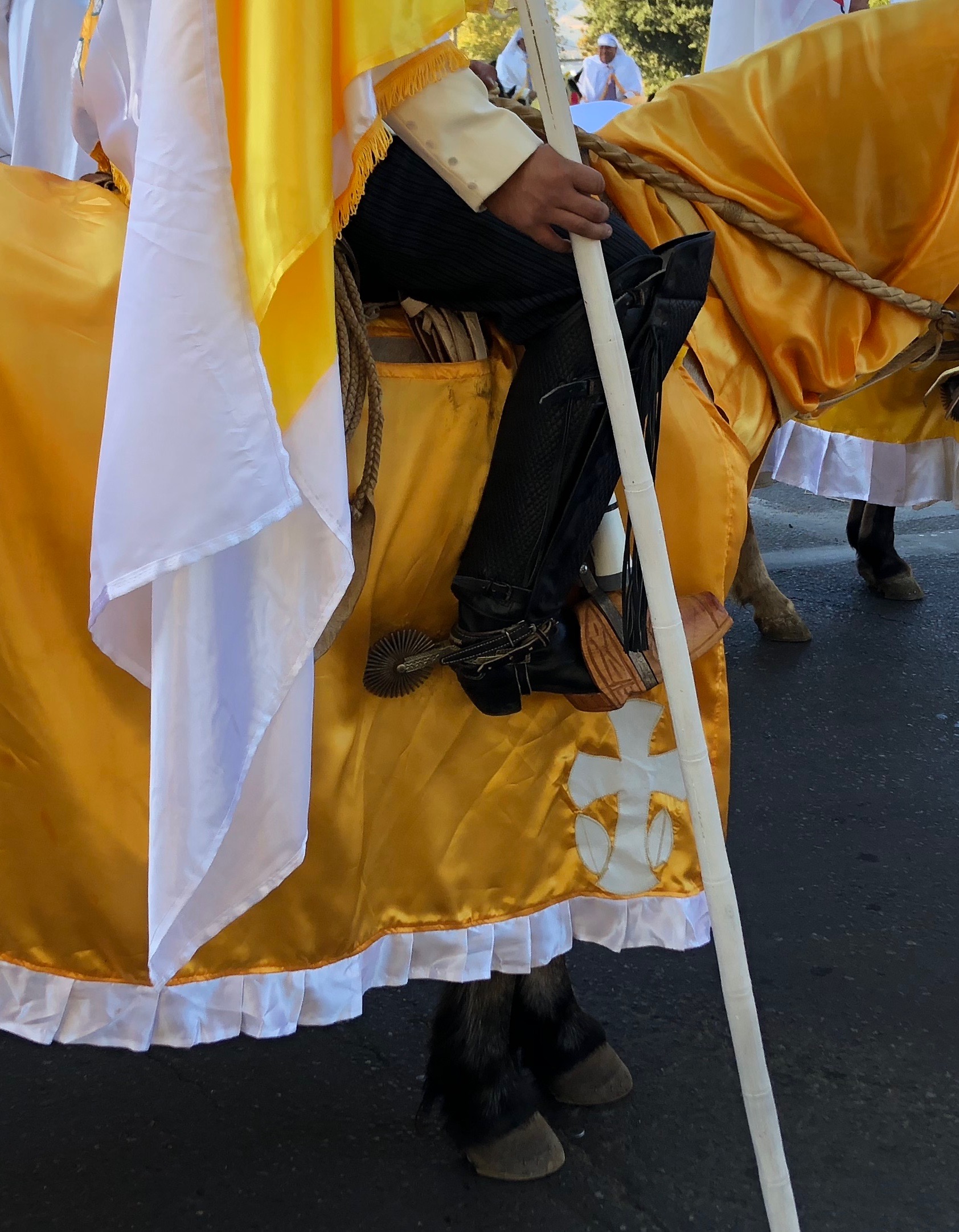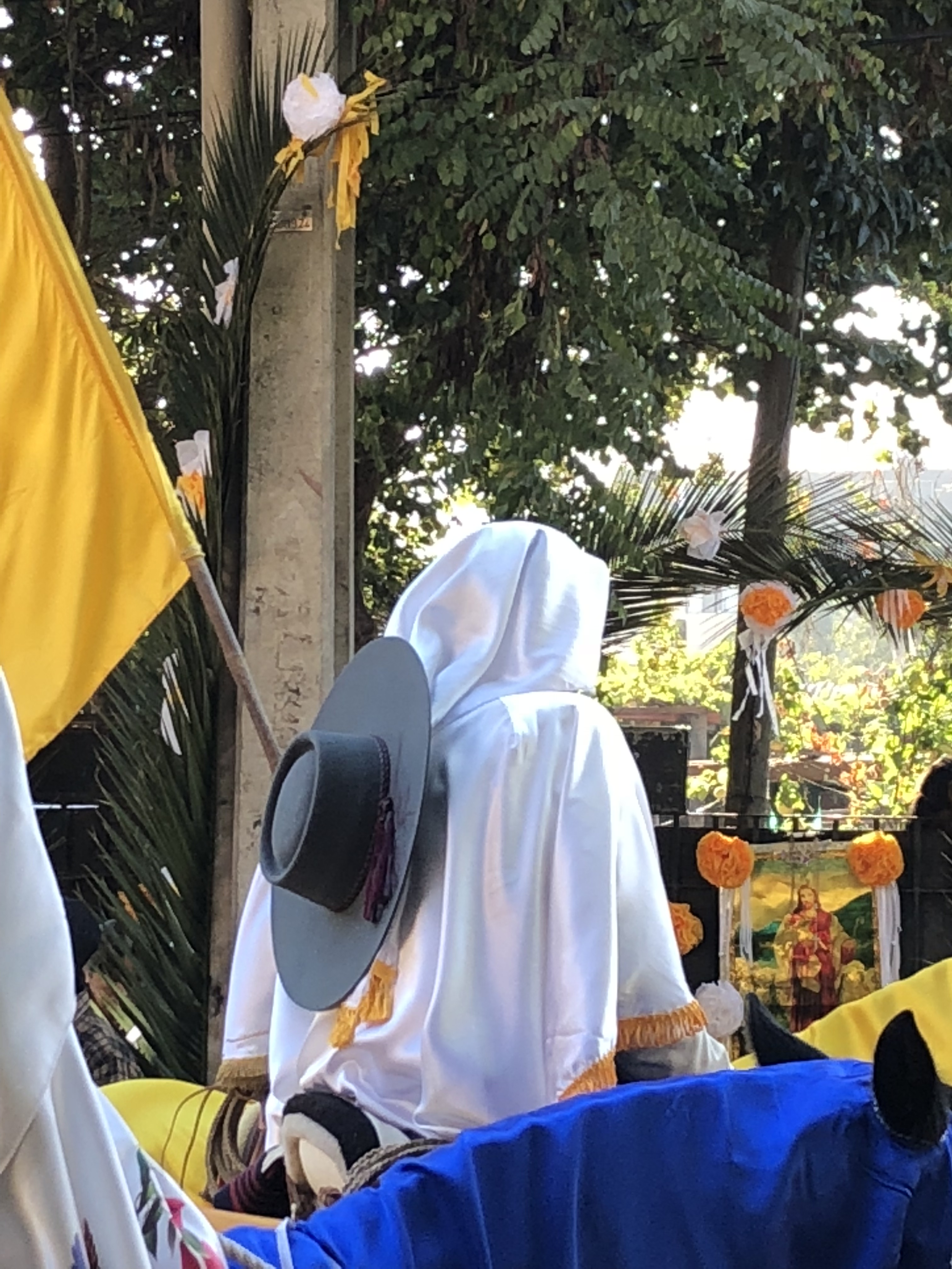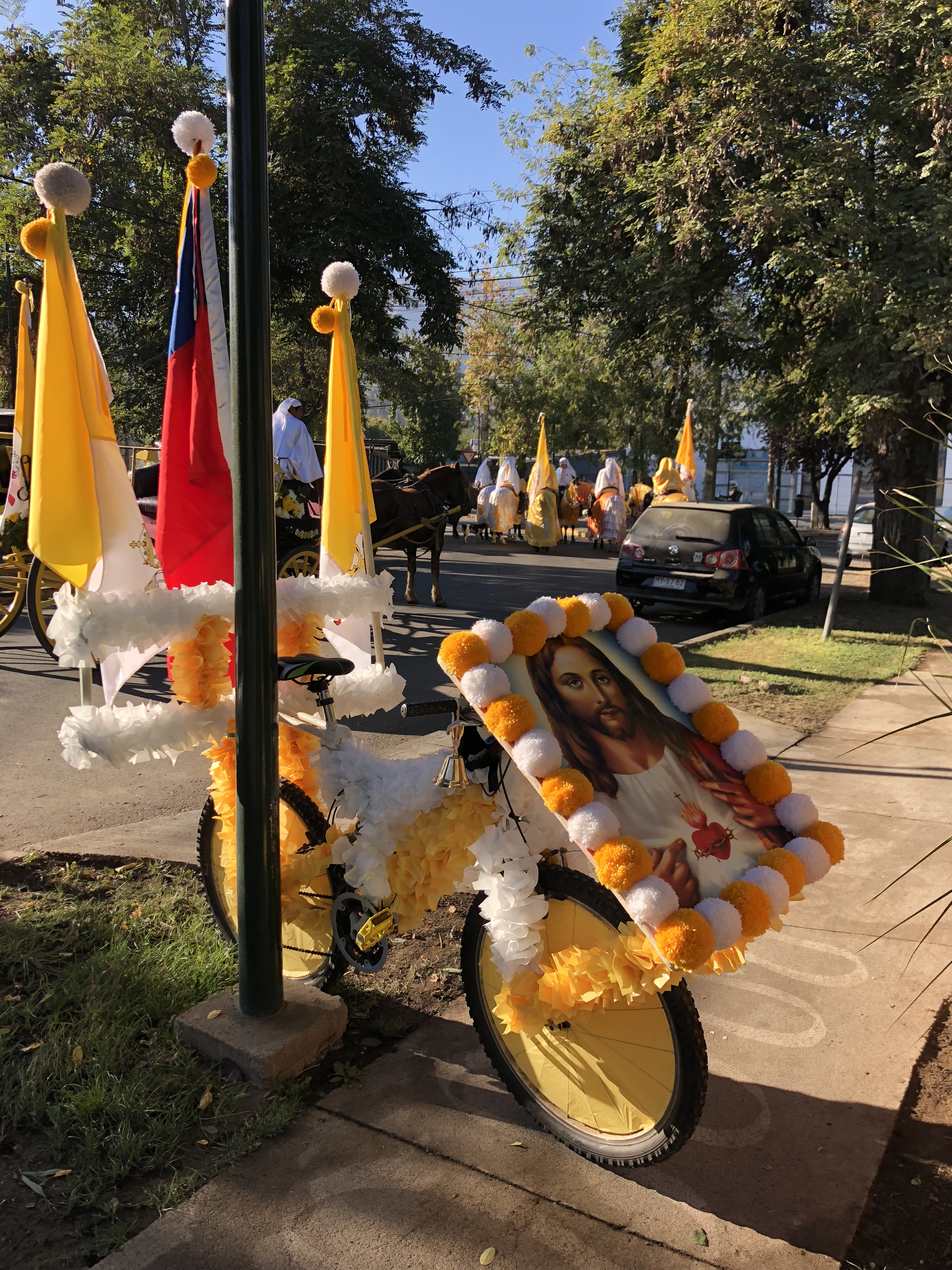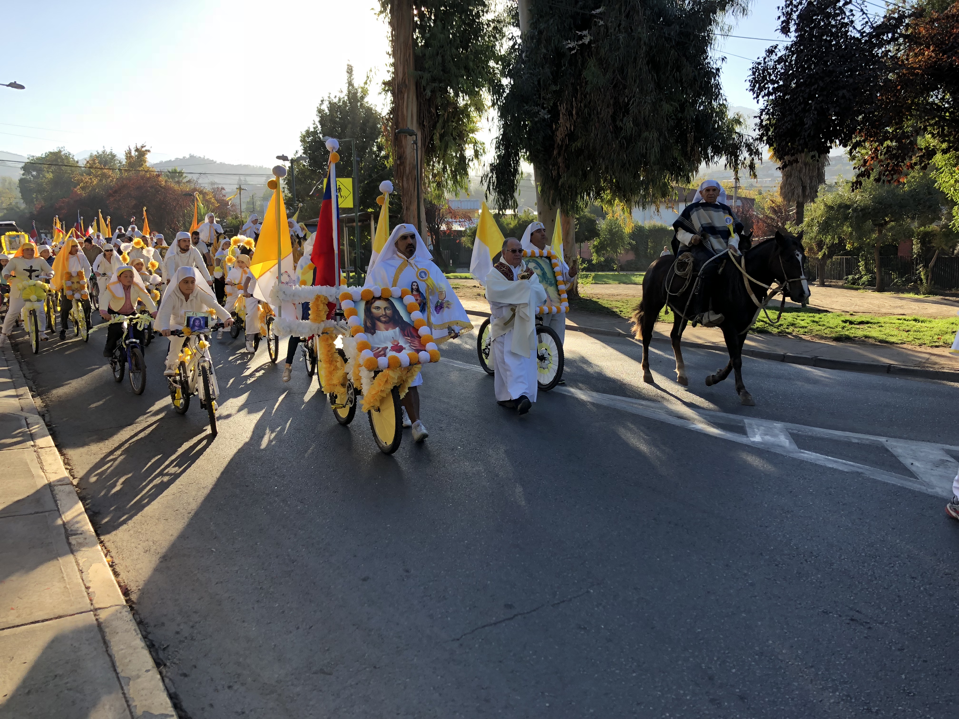 The bikes and horses are decorated in yellow and white and the cuasimodistas wear white kerchiefs to symbolize purity. An houses are also decorated in the same way.