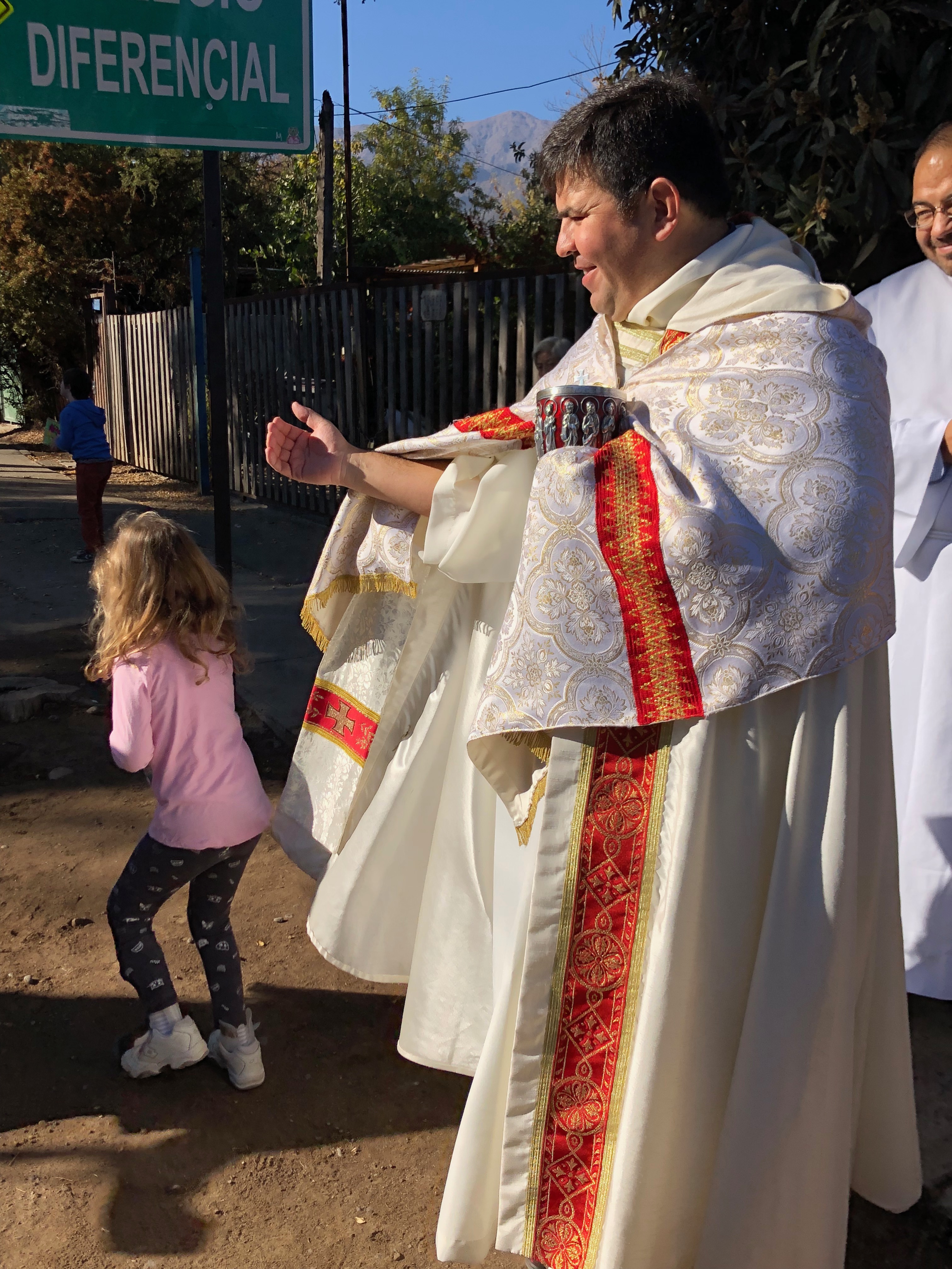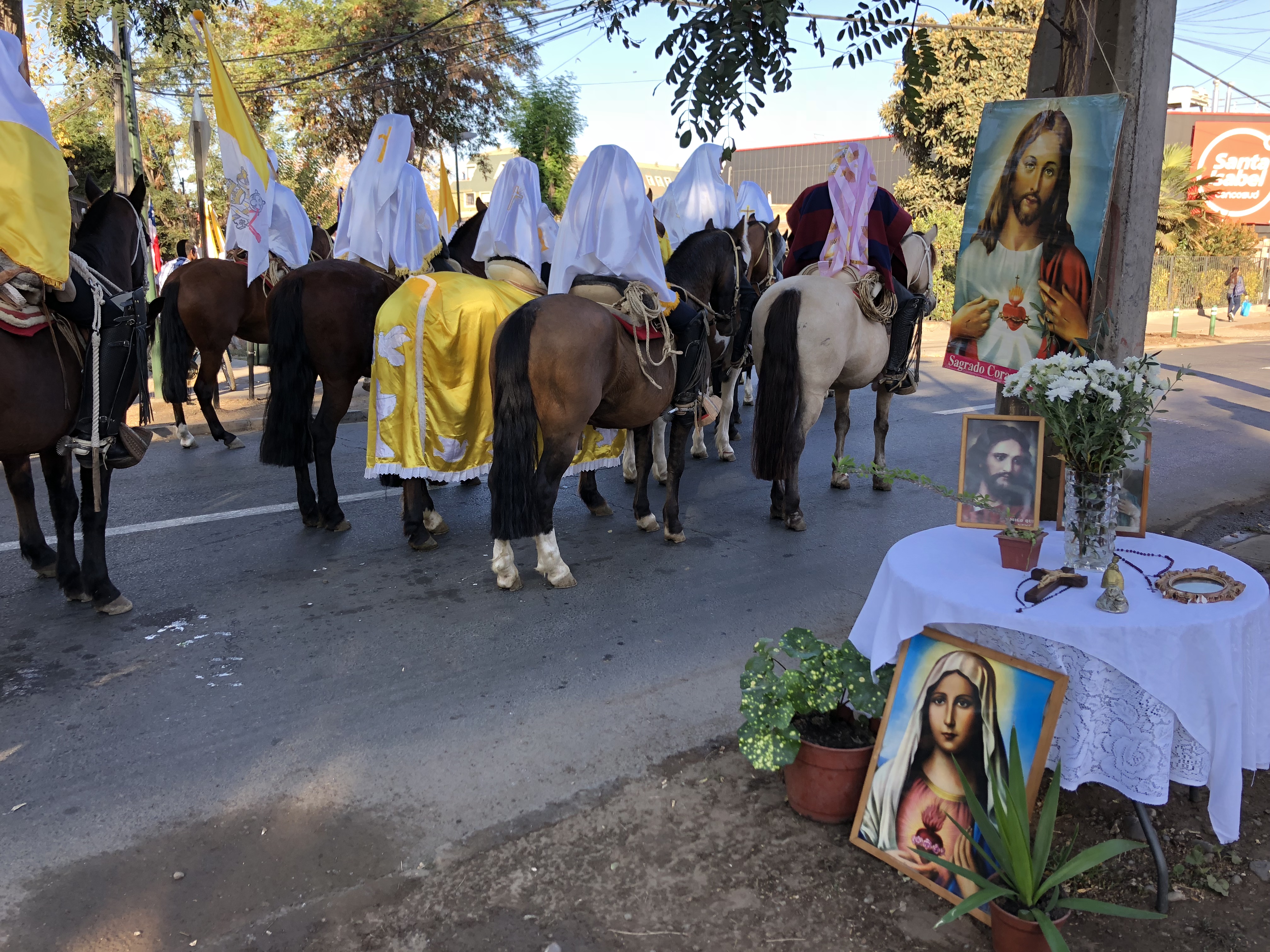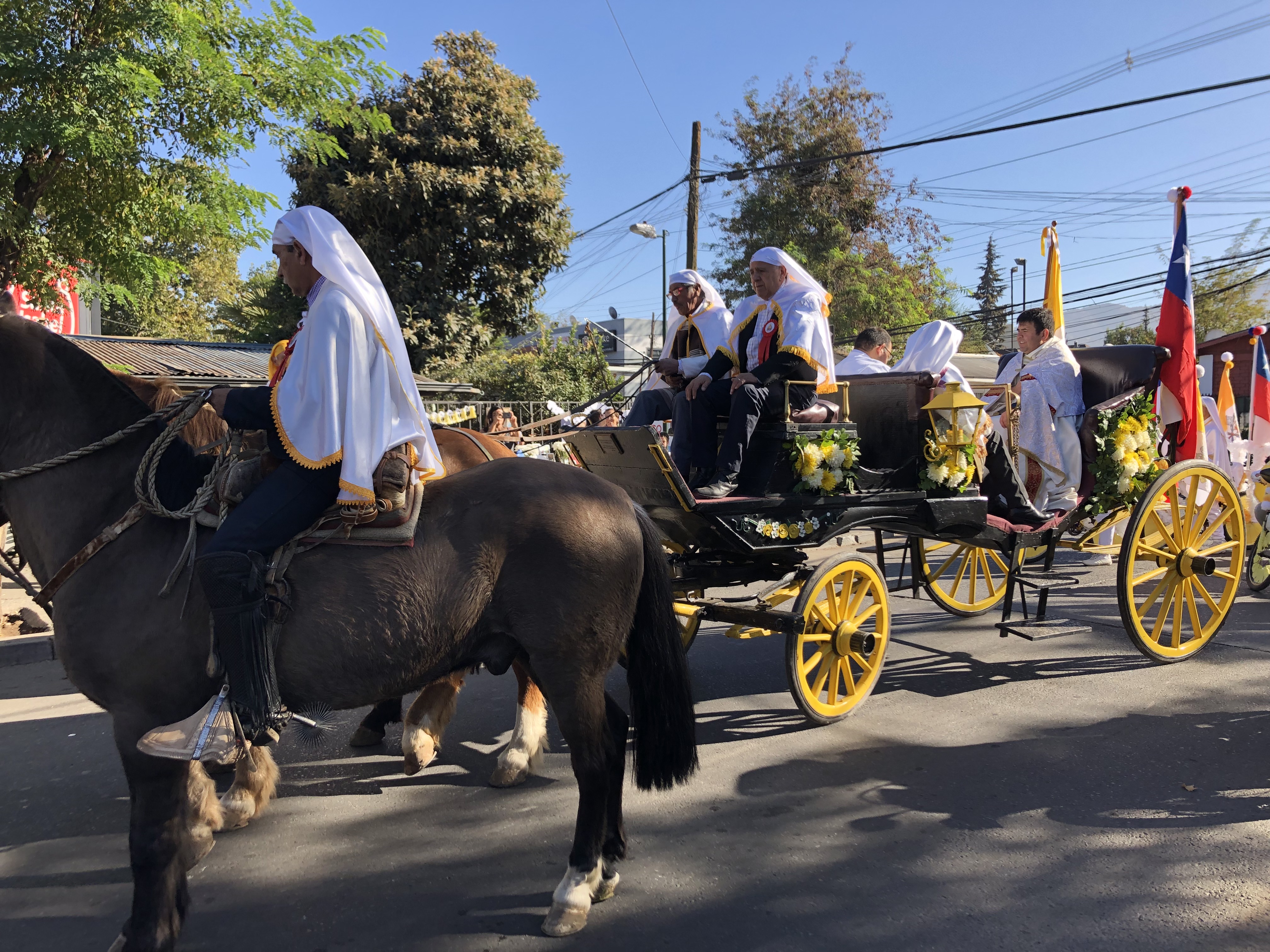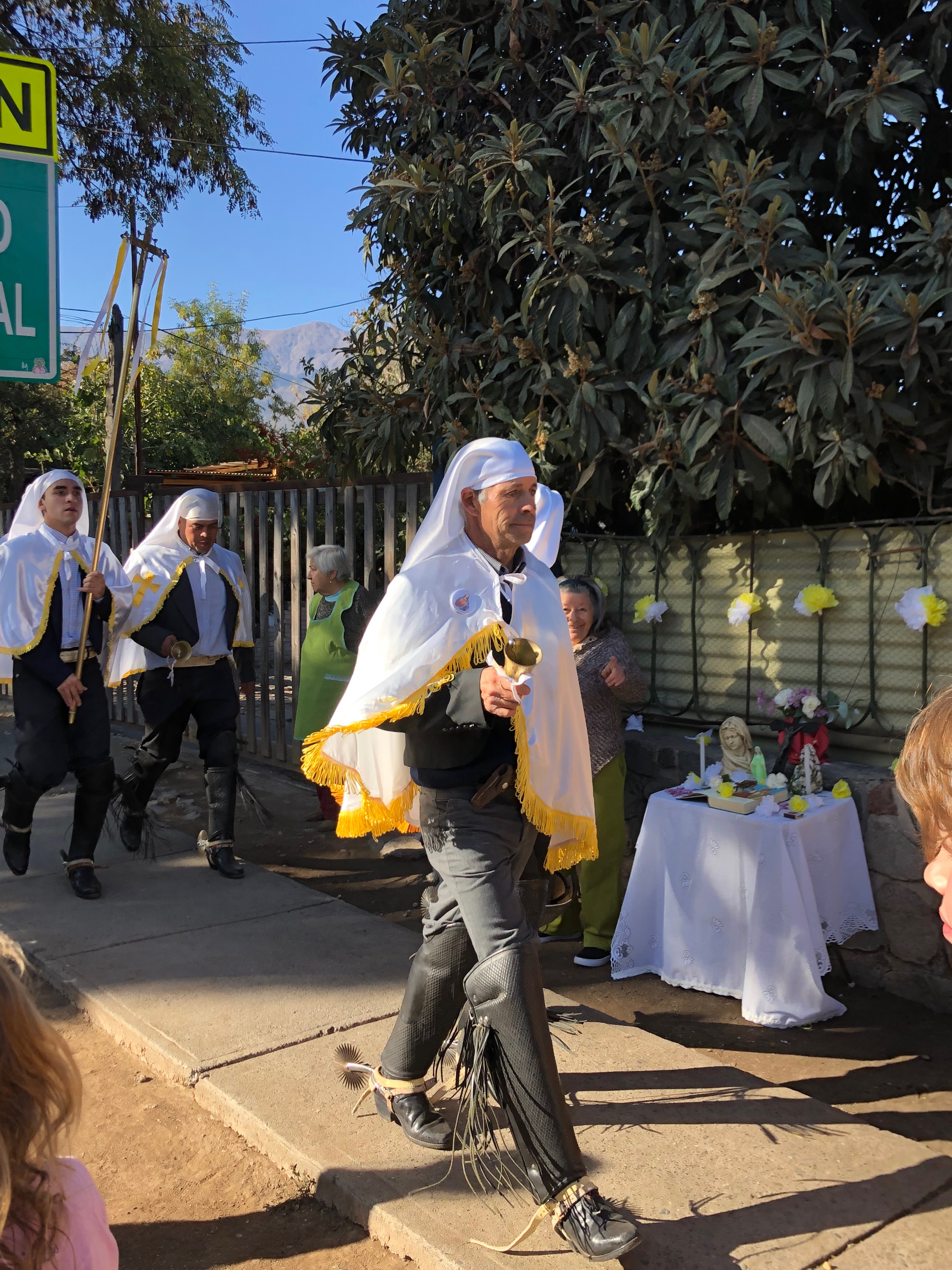 The priest rides in a horse and buggy and administers communion to about 40 infirm and sick people at home in their houses. The cuasimodistas follow him through the streets shouting “Hallelujah Christ Lives! He is King!” in Spanish as the crowd surges through the old streets of Lo Barnechea. It ends with a mass at the Medialuna (rodeo ring) on Camino Medialuna.