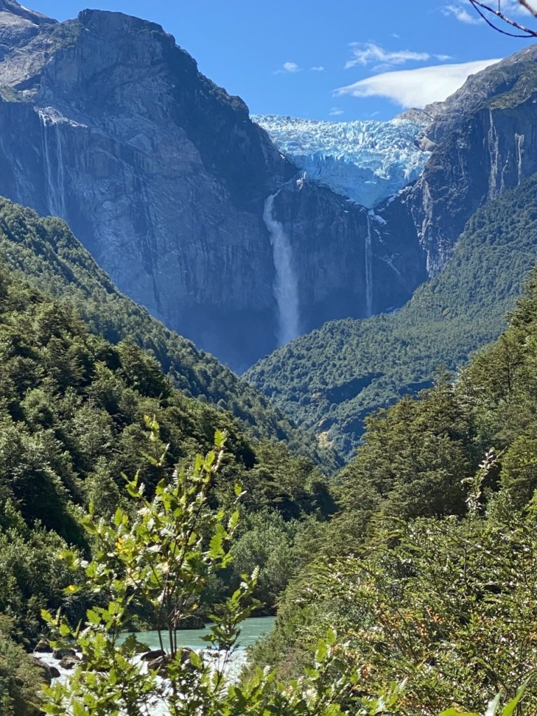 The following day we spent the day in Parque Nacional Queulat which is another of one of Chile’s many national parks. This was was quite impressive as they had accessible trails from the parking lot to see Ventisquiero Colgante, the hanging glacier — the boardwalk made it easy with children but also for buggies or wheelchairs. We then took the trail (1.5 km or so) to the boat launch and took the boat out to see the glacier. They told us in the 1970s the glacier was all the way out to where the boat left from and now it’s way up at the top of the mountain! You can do a more advanced hike up along the ridge to the top of it.