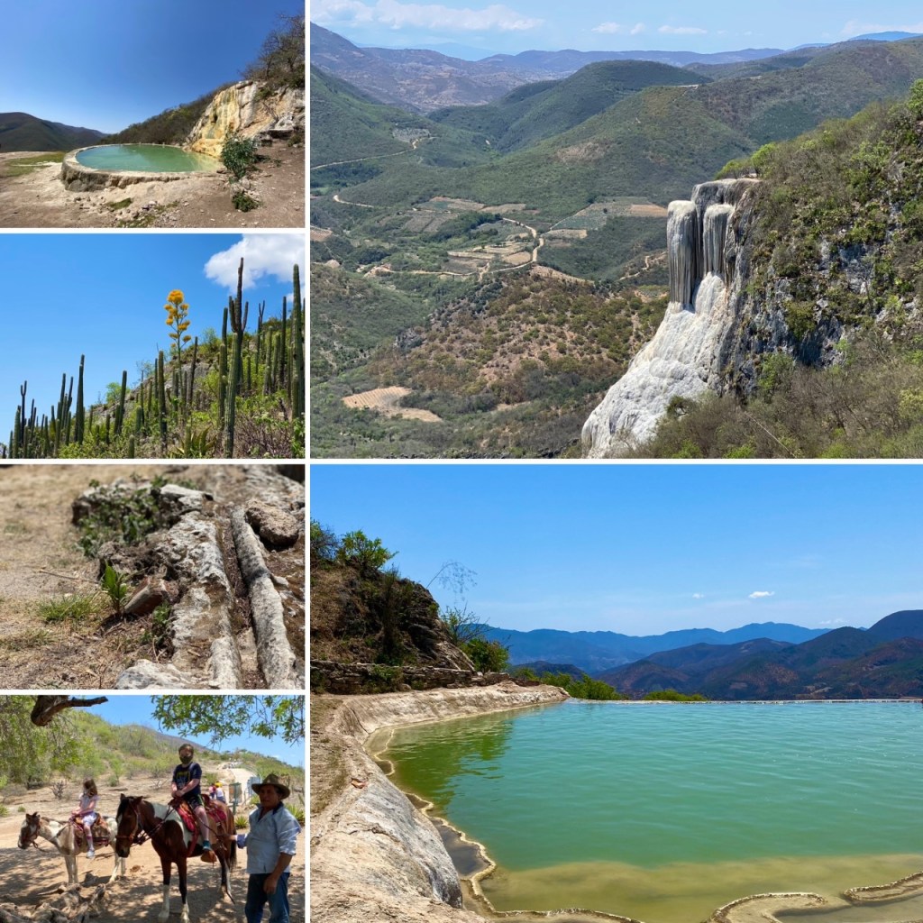 My geologist friend said the rocks are tufa, she said they are formed because the hot water in the ground leaches out minerals from the rock, then when it cools, it deposits the minerals again. Because the water is moving, the formation is globular and not crystal. You can hike around to to the top of the big petrified waterfall, or take a dip in the pool below one that is currently forming. The views out over the valley are gorgeous. There is a man with a donkey and a horse who will take you back up the hill for $50 pesos per person which we did for our two youngest. We left at 1 p.m. and we were really glad we did as the whole road was full of mini vans, small buses and cars squeezing their way up the dirt road. Maybe because it was a weekend it was busy? Either way, I would go in the morning.