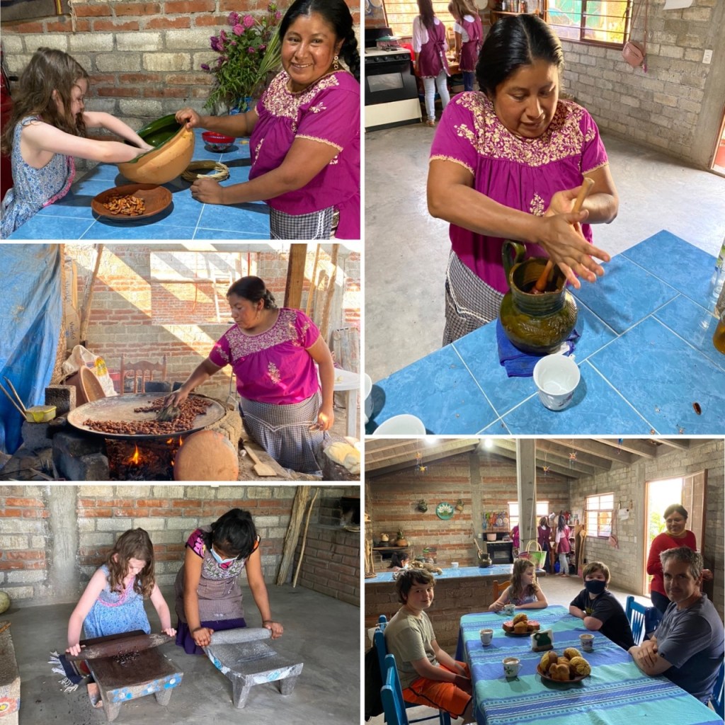 One thing Oaxaca is really known for is their chocolate and cooking. We didn’t really have time for a cooking class with the children, but we all wanted to learn about chocolate. A friend had booked with Flor to do just that so we did the same for Tuesday morning. She was really accommodating as we said we didn’t need four hours but could we please have maybe two hours instead. We met just outside of Tlacolula and followed Flor to another nearby village where we drove to Dalia’s house. Dalia and her daughters taught us how to sort the cocoa beans, roast them, peel them, grind them to a paste over coals and then finally enjoy a hot chocolate! Complete with homemade tortillas, guacamole, salsas and sweet breads. We all really enjoyed it. To book, contact Flor, she speaks Spanish and English. +52 951 149 3394.