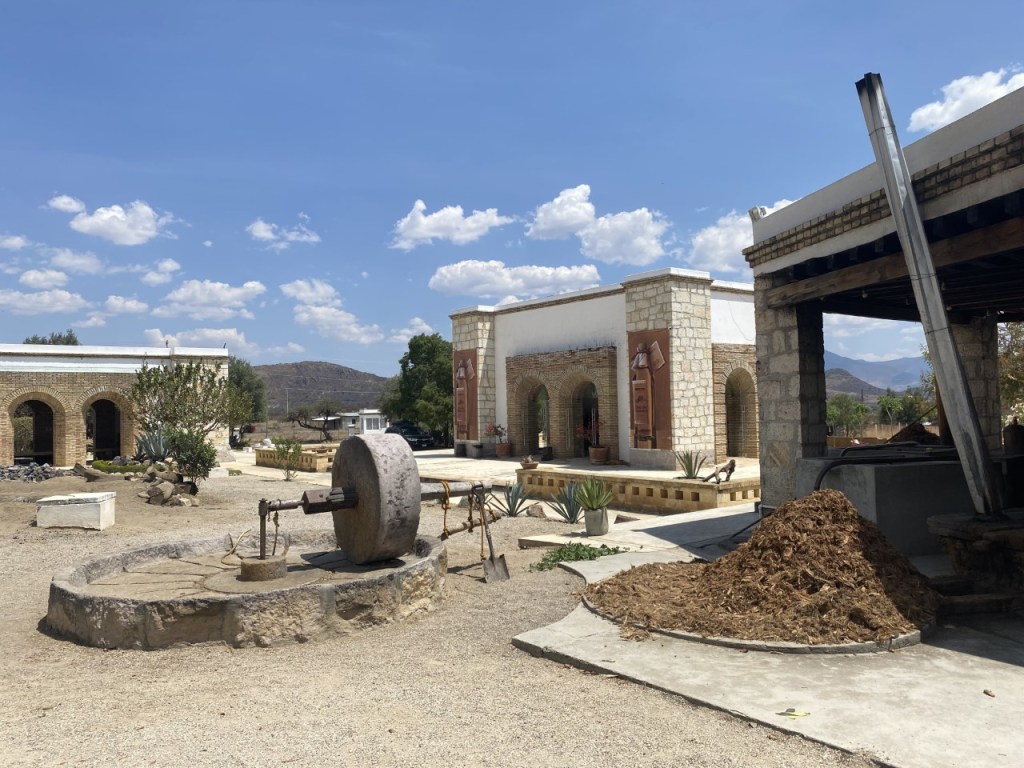 In the afternoon we drove a 15 minute drive down the road to Oro de Oaxaca mezcal to see how mezcal was made. It takes 8 to 23 years for the agave cactus to be ready to harvest. Then they chop off the leaves and there is a bulb — called a piña / pineapple — in the earth and that is what they use. Then they put the piña in a dirt pit, cover it in firewood and rocks and slow roast it. When it’s done, it is taken out and put in a stone circular platter that has a stone wheel, and a horse or donkey walk around it in a circle, using the wheel to crush it to a pulp. Then, the pulp is fermented. In this case it was in wooden barrels covered in water and let to sit for days or up to a week. It was 35C when we were visiting so it was extremely hot. No wild yeast is used, they just let it ferment outside naturally. Then it is siphoned off. A very interesting process, and now I understand more why it is so smokey in flavour.