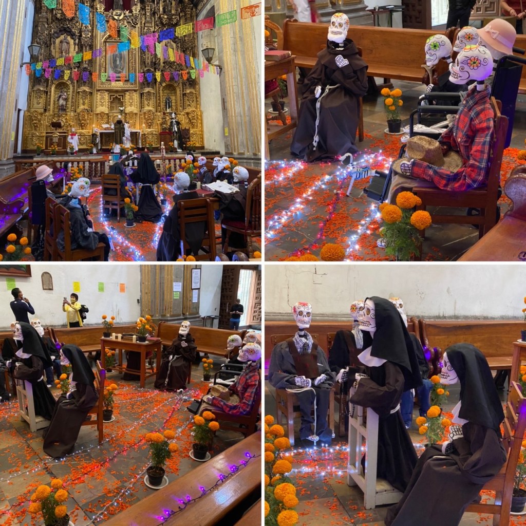 Other elements include sugar or chocolate skulls, pan muerto (a bun with nubs like bones on it and covered in sugar), cempasúchil (yellow marigolds that are the biggest marigolds I have ever seen!) which are set out so the yellow petals offer a path for the spirits to find the family’s homes.