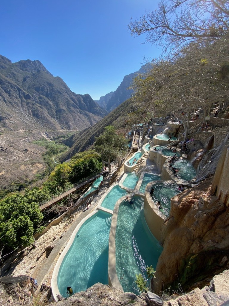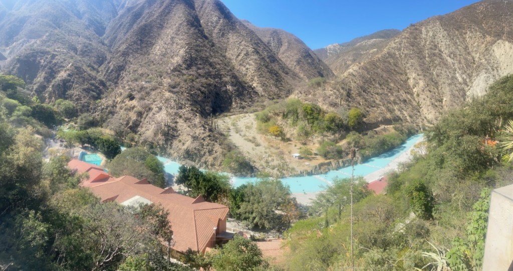 Once we got to the hot springs the first thing we did was soak in the manmade pools on the hillside filled with aquamarine water. They were very pleasant and the higher up the hill you go, the hotter they are. We had a beautiful sunny day, not too hot, but even with the sun we found the pools were tepid to warm. Not overly hot. Which would be perfect for children who can’t handle very hot water. We were given 1.5 hours for the pools and initially we thought this was too little, but actually we were getting a bit cool, so it was perfect. Then we walked through the different paths past all the pools and over the suspension bridge to the cafe area. You will also pass by the camping area here and a hotel.