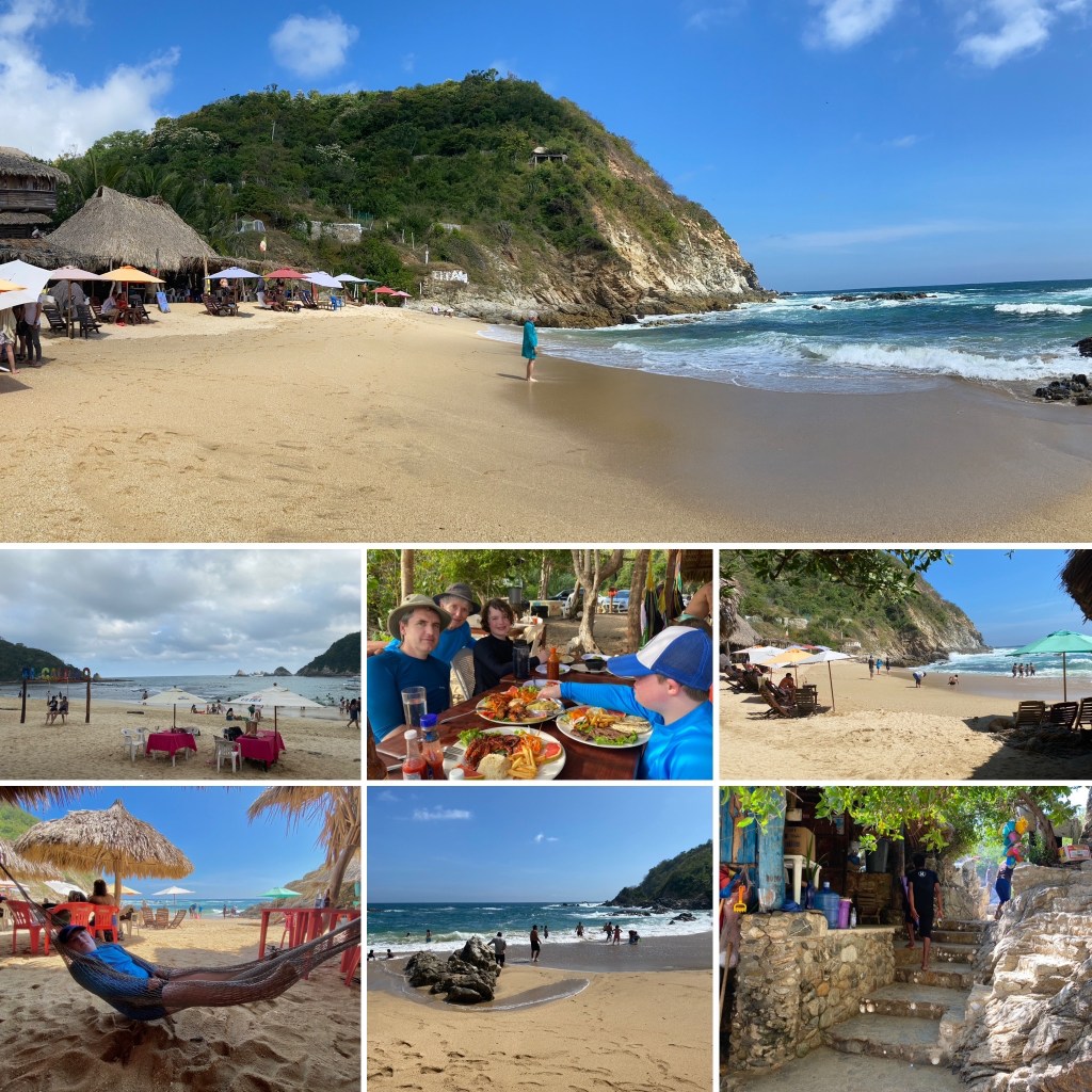 We had a red flag the next day on San Agustinillo so they told us the most calmest beach in the area was half hour away in Playa Estacahuite. The parking was pretty harrowing! ( There is an upper parking lot, which if you can walk down the steep road I would take it, as we have two children with mobility issues we drove down a tight curvy road to the bottom and squeezed into a lot with other cars. It took a 5 point turn to get out of the spot but it worked!) This was a very sweet little beach, actually it was two beaches with little huts and cafes built over the rocks and a small walkway between them. Someone beckoned us to follow them to rent a table and palapa (shady palm) at their cafe. You go up and over the rocks through a little passageway and there is another cove on the other side, with hammocks and shade. It was very nice and rustic, but the waves were still really rough. We were told it’s normally like glass it’s so calm, but a group of 20 year olds were in the sea all linking arms in a circle and they got washed out a bit. We spent a really nice day here and splashed at the water’s edge. The cafe only took cash.