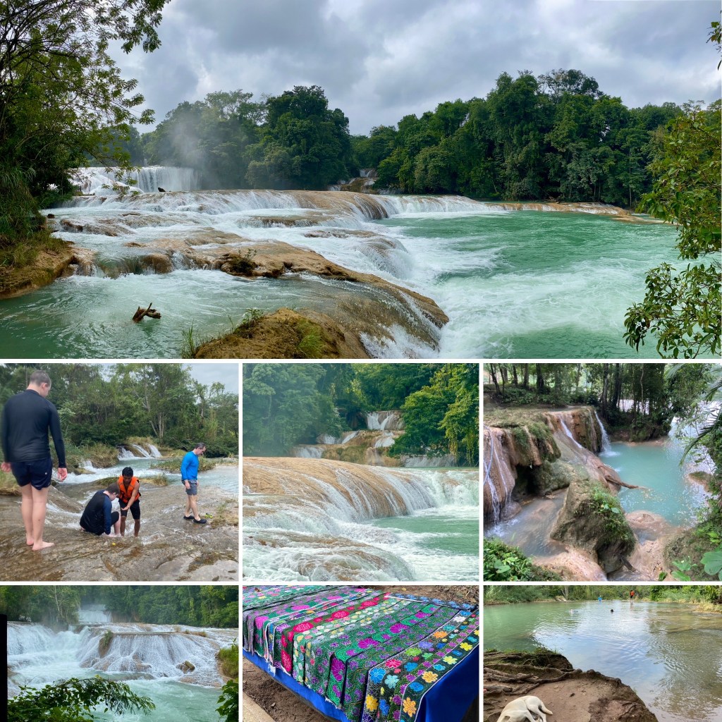 The falls were long, and low with multiple pools and layers with such green and vivid blue! The photos of the waterfalls that you see are taken by locals when the water is low, so it was impossible to walk out into the middle of them. There weren’t many people at all when we arrived at that hour. There are two areas to go swimming. We went to the top area and a local guide showed us where to dive and jump in safely and he took our phone and took photos and videos (for a tip) he spent so much time with us and was so great with the kids, he was just lovely. There was really good local crafts shopping here and when you catch a glimpse of the homes behind the shops I was really happy to support their economy. (hahahaha!) We ate at Charly’s (across from the bathrooms at the entrance) which was a very popular spot. We had fish and shrimp and the food was fast and good and reasonable. We left at 4 p.m. for the two hour drive back to Palenque.