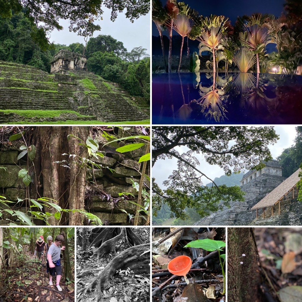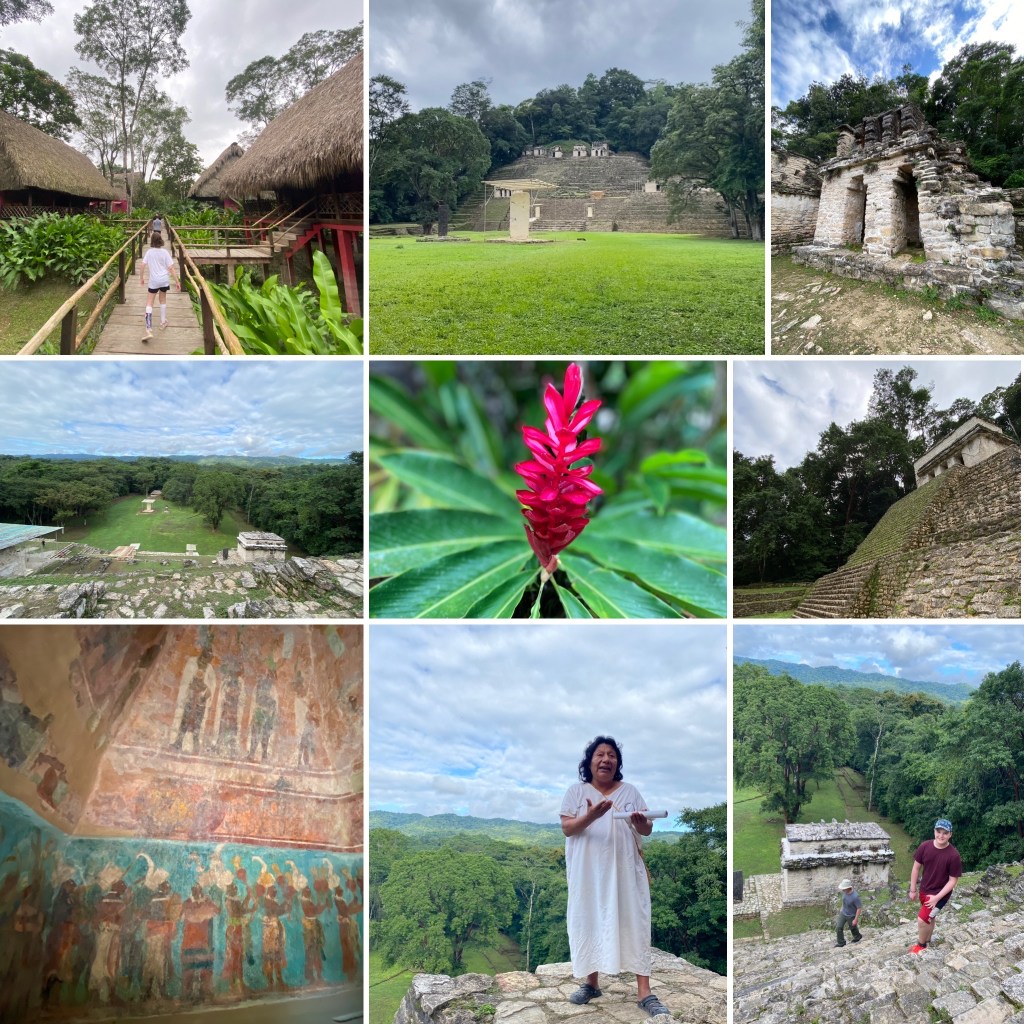 Our last day in Chiapas and we saved the best for last. We went to the pueblo magico of Palenque and we were at the archeological site at 8:30 a.m. We decided to do the jungle walk (it was about $1,200 for a short tour of $2,600 pesos for the six of us for jungle and pyramid tour). You can book a guide in the carpark. We saw a little capybara snuffling in the woods, so that was cute and we heard the howler monkey again howling at another group of monkeys — the guide said they are territorial for the fruit and they are howling to say “don’t eat this fruit, I’m here with my family.” We heard a toucan, we tried out a Tarzan vine (which one of our members broke! Not me….) The guide said May is the best time to see the animals. He did all our birthdays of the Mayan calendar which was fun, our eldest was King of the Water, youngest has balance of intellect, mother-in-law was visual, husband was serious and profound and I was the monkey (sigh). But also “covers a lot and takes a little” so maybe I’ll go with that definition! The kids loved that part. We sniffed out rotting smells which was a boa constrictor laying eggs. By 10:15 we had finished our walk. The children liked it and it was not difficult as it was basically just off the parking lot. Having done walks in the Ecuadorean jungle in the middle of nowhere I hesitate to call it a “jungle walk” but it was a walk in the woods and it was interesting. I wouldn’t have done it if I didn’t have kids.