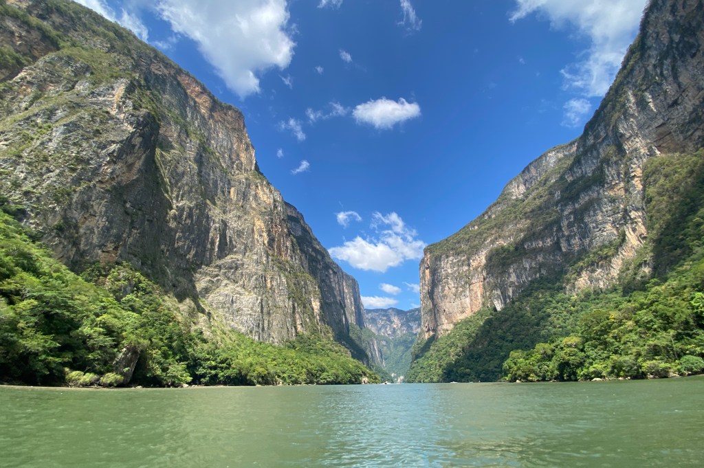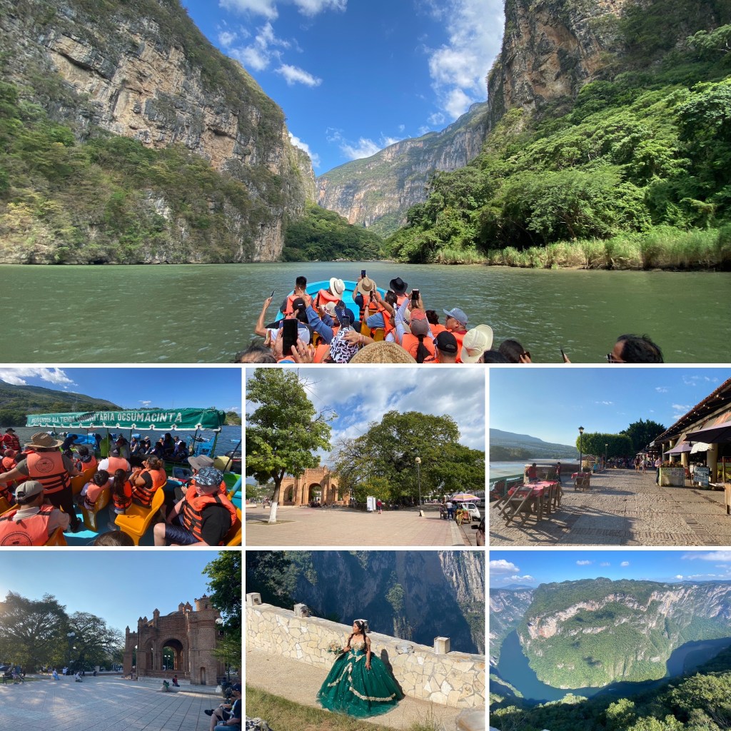 We had breakfast at Cafe de Chiapas (kind of like a Mexican Denny’s maybe?) and it fit the bill for being plentiful and fast with good variety. Then we were driven to a boat launch. At first glance we had no idea what we were getting into. It was mayhem. There seemed to be nobody around and yet we had to wait for many boats. And the launch looked like a rather inauspicious little bit of lake to go around. However, once we got on the speed boat, it ended up taking us up Cañon del Sumidero, on a river that snaked through the large canyon walls that go up to one kilometer high. We saw crocodiles sunbathing, the highest point of the canyon wall where the indigenous peoples jumped to their death rather than be taken by the Spanish, and a Christmas tree of greenery made from a waterfall. So we were pleasantly wrong about what we thought was in store for us! We had a really good time on the boat.