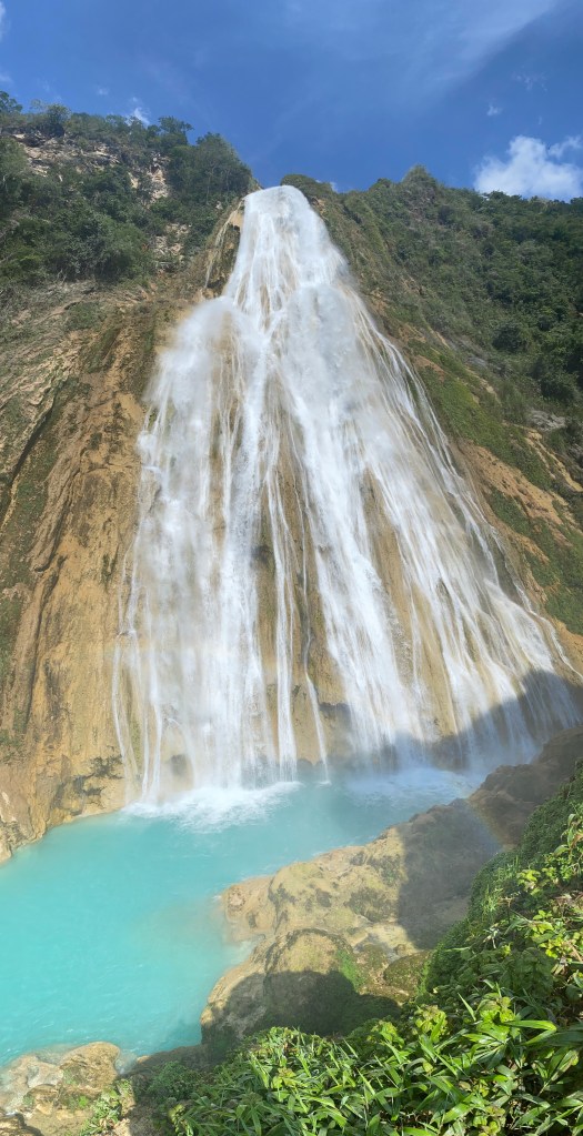 Next up was Cascadas Chiflon a waterfall (about $80 pesos pp to enter) with a 120m drop, but first we had breakfast outside the gate along the river for $600 pesos for six people. There are a couple of different walks you can do, we did the longer one (thought the short one on the other side of the river also seemed to end where we did so maybe you drive for longer? We couldn’t tell.) Ours was 2.4 km round trip and you could have an done an additional 1.4 km round trip extension, which we didn’t have time for. My husband, two children and my mother-in-law chose to zipline back! Prices ranged from $300-$600 pesos depending on how long of a zip you did. The pools along the path said no swimming, but everyone was wading in and they were shallow and would have been refreshing. There are about 756 stairs during the walk.